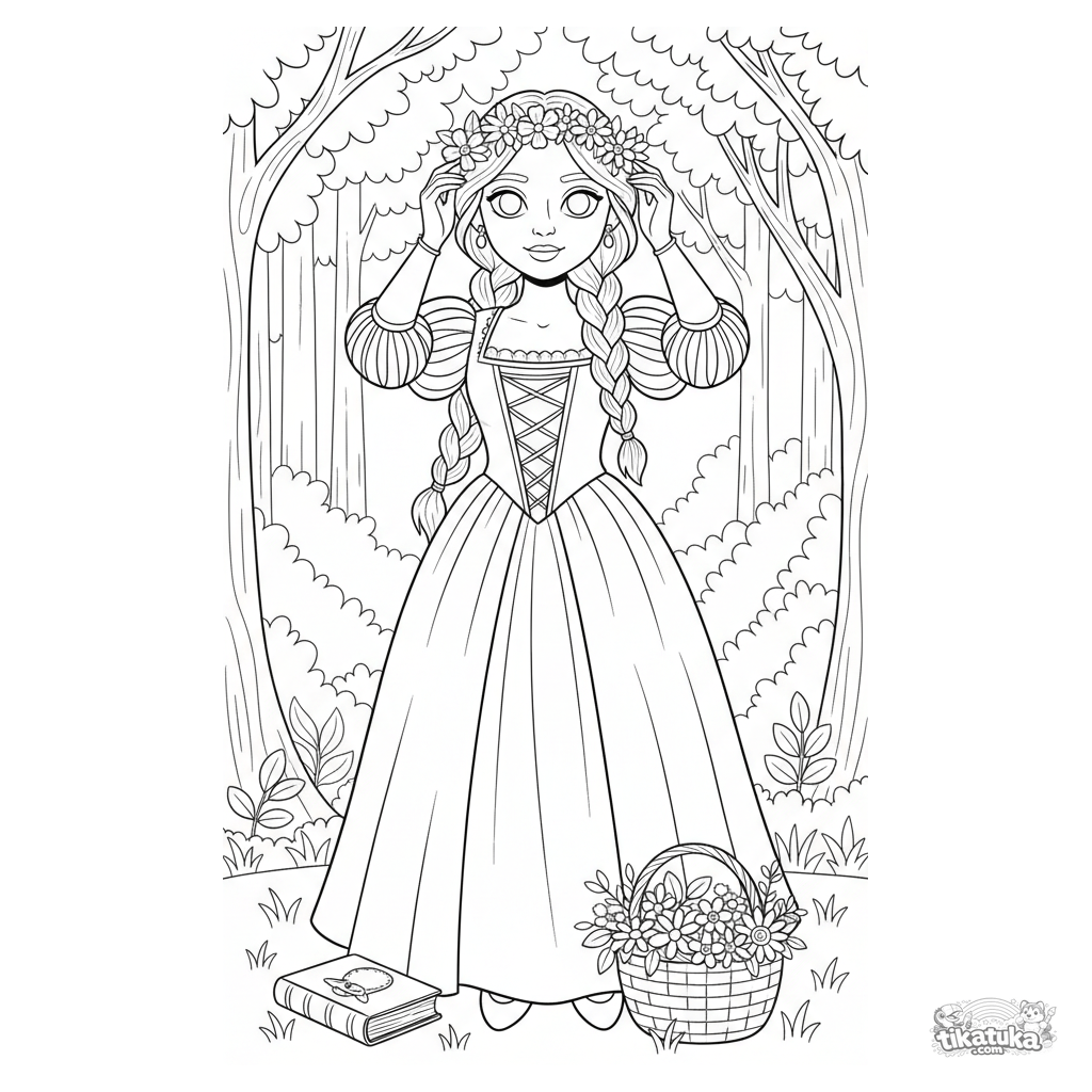 Раскраска для девочек 10-12 лет: детальное платье эпохи Возрождения в лесной поляне. Сложный фон и аксессуары. Бесплатная печать.