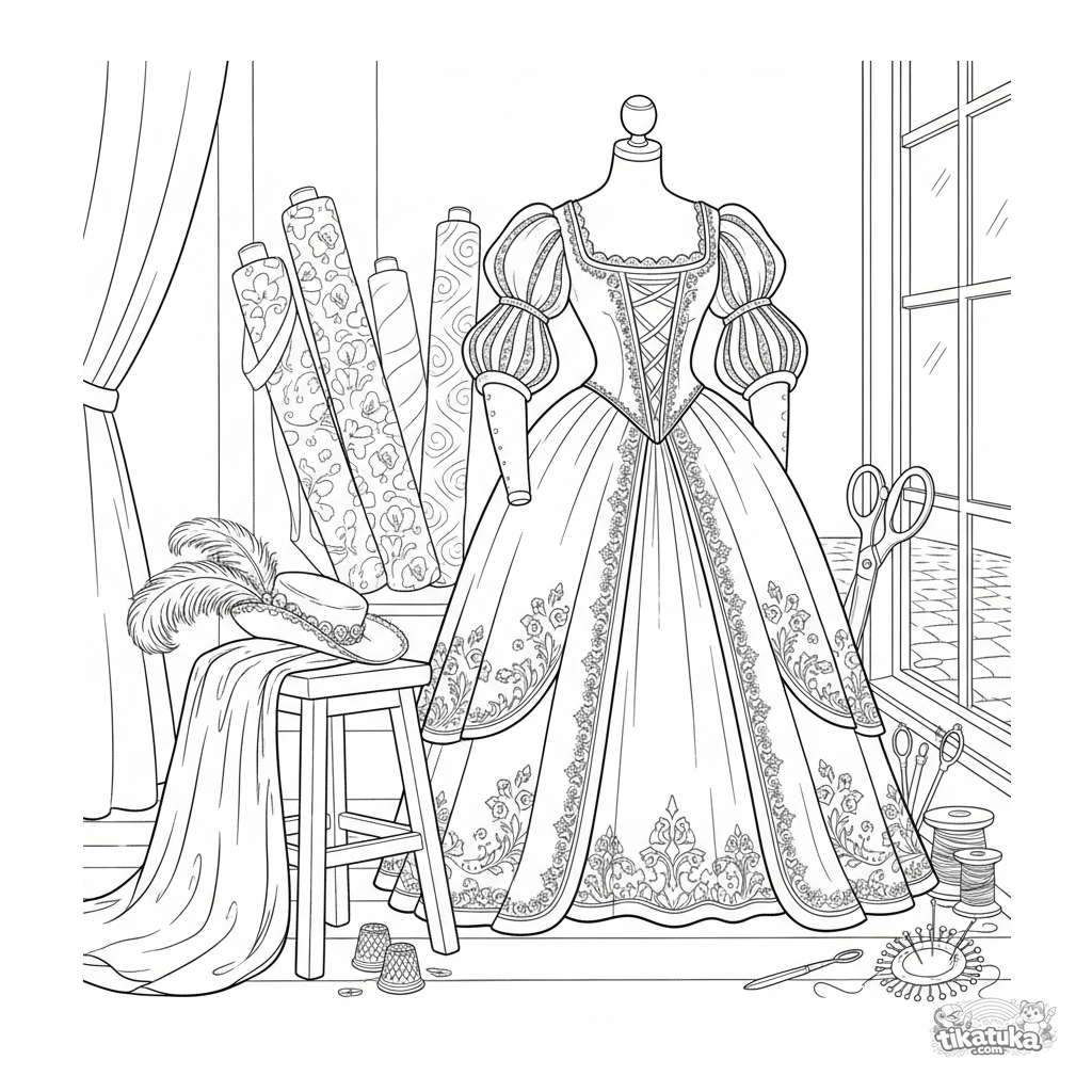 Детальная раскраска для девочек 10-12 лет: платье эпохи Возрождения на манекене в витрине бутика. Текстуры ткани, кружева, аксессуары. Сложный рисунок для увлеченных творчеством.