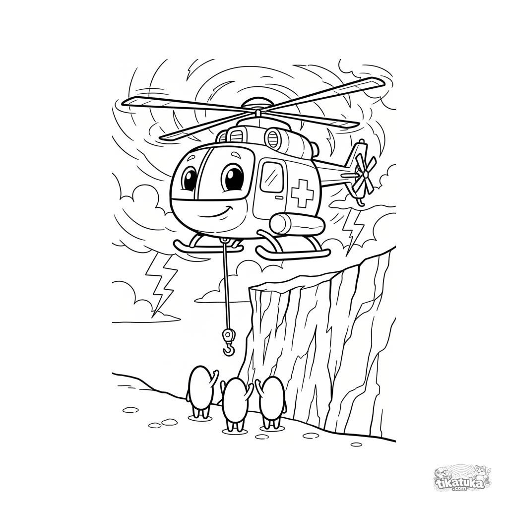 Раскраска для детей 7-9 лет: спасательный вертолет с красным крестом завис у скалистого утеса во время грозы, в небе сверкают молнии, вниз спущен трос.