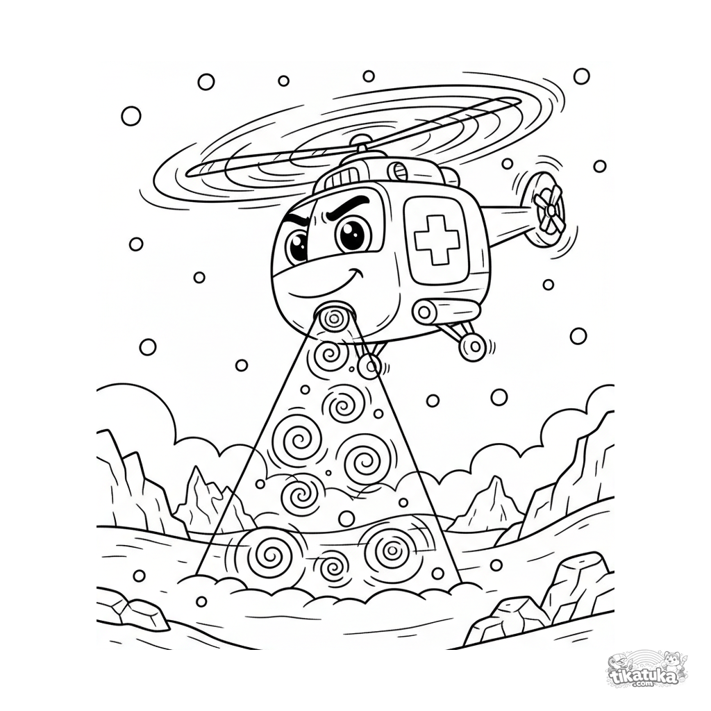 Раскраска для детей 4-6 лет: спасательный вертолет в снежной арктической буре. Динамичная сцена, четкие формы, понятный сюжет.
