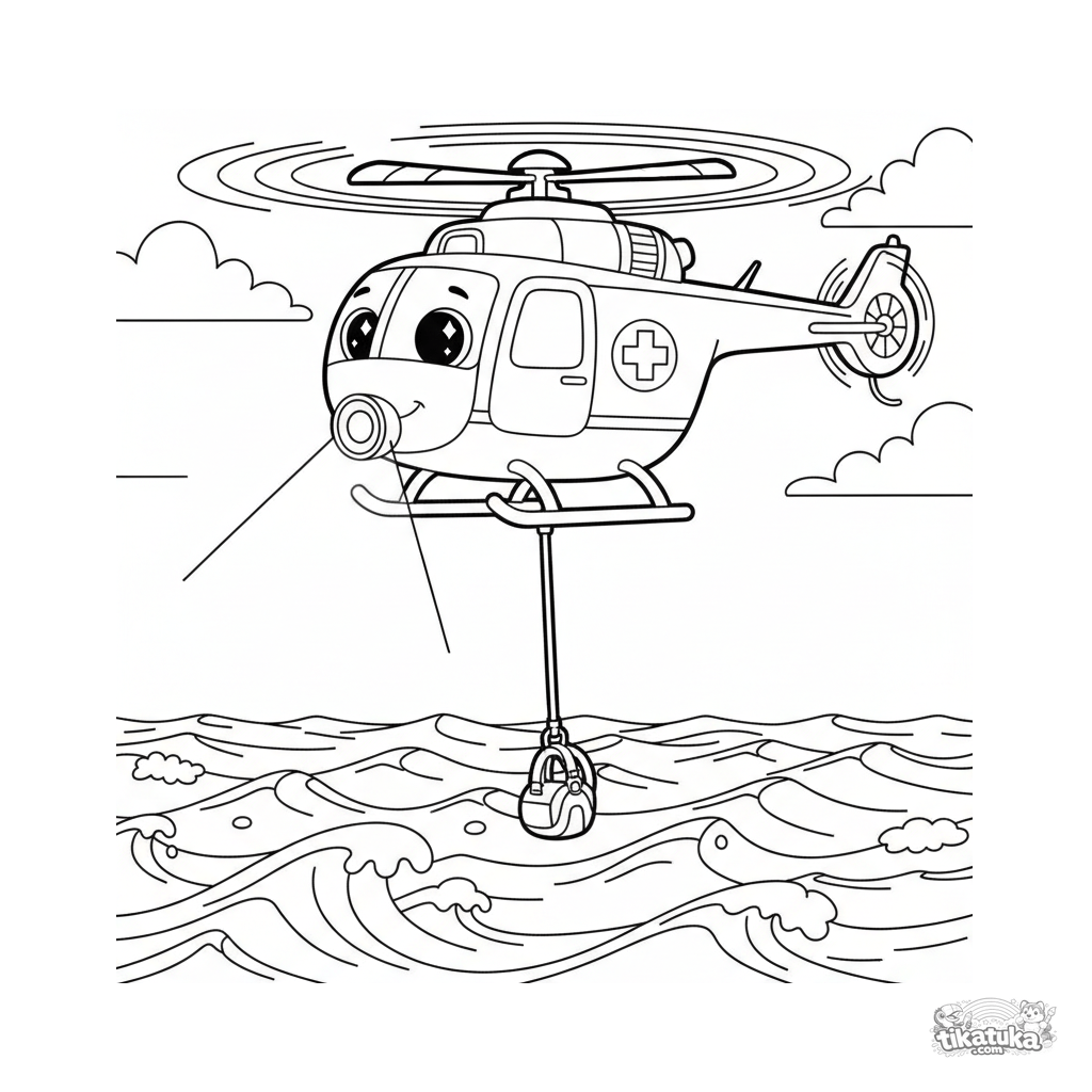Раскраска спасательного вертолета, зависшего над океаном. Для детей 7-9 лет. Четкие контуры, динамичная поза, трос спасательной лебедки.