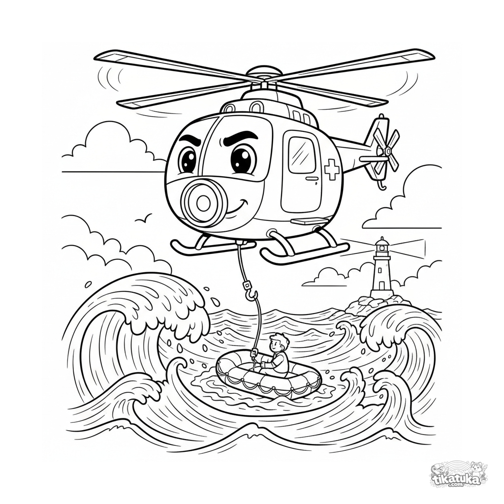 Раскраска со спасательным вертолетом, парящим над бушующим океаном. Для детей 4-6 лет. Яркий динамичный сюжет, четкие формы.