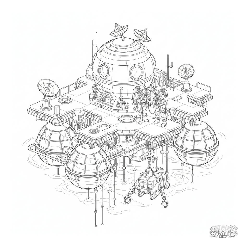 Раскраска для детей 10-12 лет: футуристическая научная платформа-хабитат в открытом море. Детализированная сцена с учеными, подводными куполами и роботом для раскрашивания.