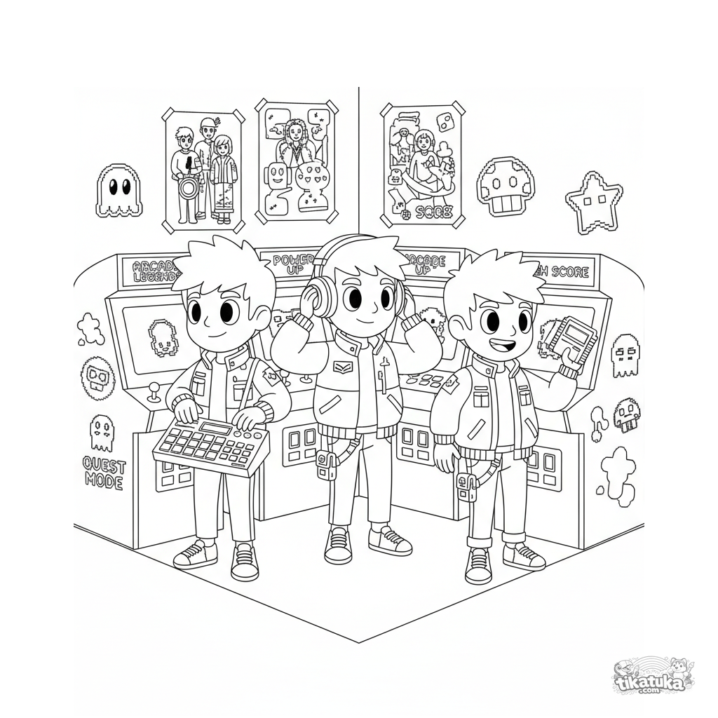 Раскраска для детей 7-12 лет: трио ретро-геймеров создает музыку в углу аркадного зала, полного автоматов и постеров. Детализированная сцена с техникой и стилем.