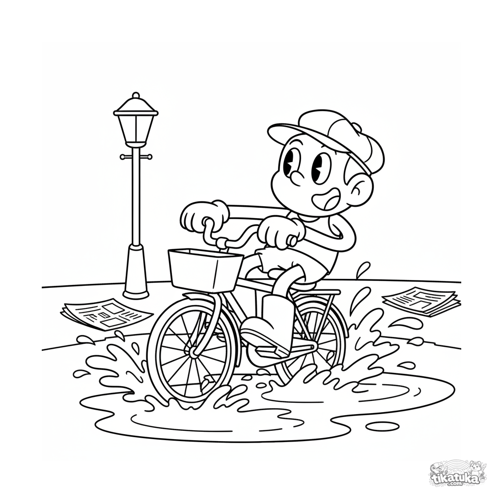 Раскраска для детей 7-9 лет в ретро-стиле 1930-х: весёлый персонаж на велосипеде проезжает через большую лужу на осенней улице. Динамичная поза, брызги, выразительные черты.