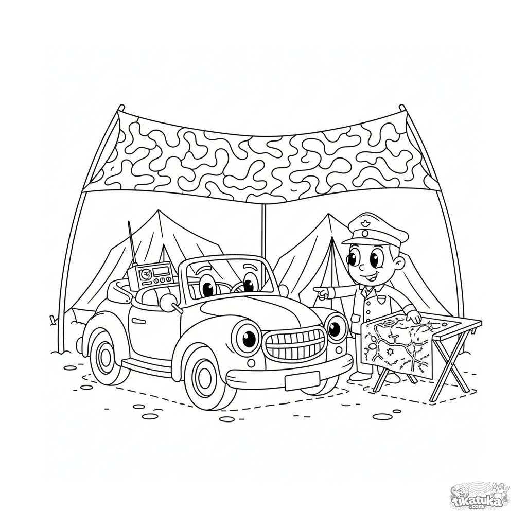 Раскраска для детей 7-9 лет: ретро командирский автомобиль под маскировочной сетью у штабных палаток. Офицер изучает карту на раскладном столе.