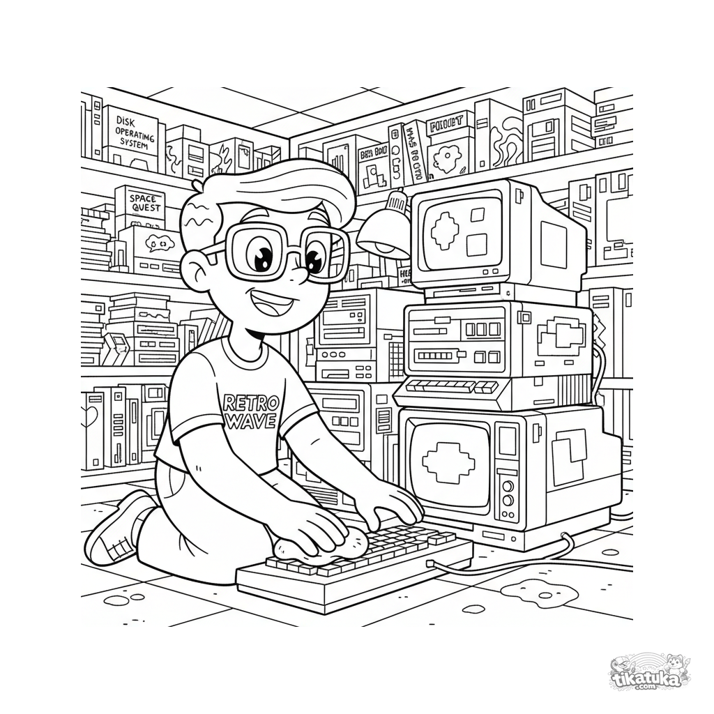 Раскраска для детей 10-12 лет: коллекционер ретро-компьютеров в подвальном архиве. Сцена с деталями: старые мониторы, дискеты, коробки, лампа.
