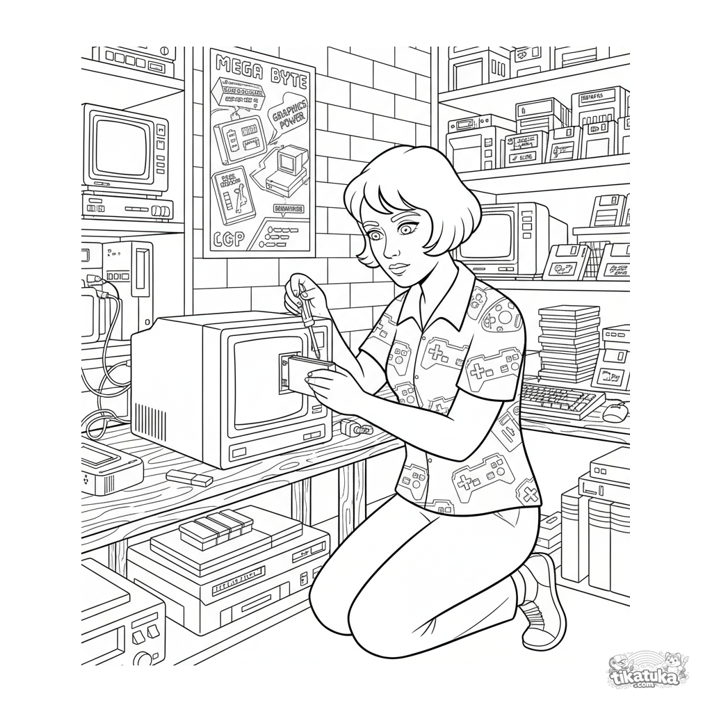 Раскраска для детей 10-12 лет: коллекционер ретро-техники ремонтирует старый компьютер в подвальной мастерской. Детализированная сцена в стиле научного справочника.