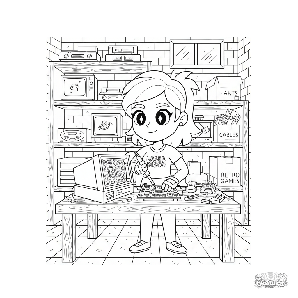 Раскраска в стиле 90-х: коллекционер ретро-техники паяет старый компьютер в подвале, заставленном мониторами и приставками. Динамичная сцена с множеством деталей для детей 10-12 лет.