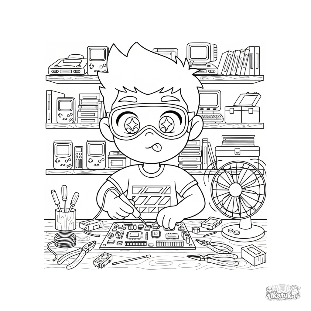 Раскраска для детей 10-12 лет: коллекционер ретро-техники в подвале паяет материнскую плату. Детали: полки с консолями, инструменты, вентилятор. Стиль 90-х Nickelodeon.
