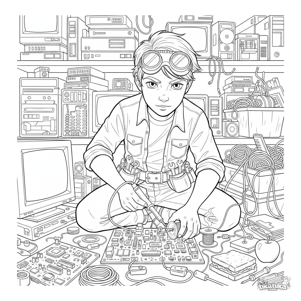 Раскраска для детей 10-12 лет: подросток, увлечённый ретро-техникой, паяет плату в подвальной лаборатории. Множество деталей, инструментов и старых компьютеров на полках.