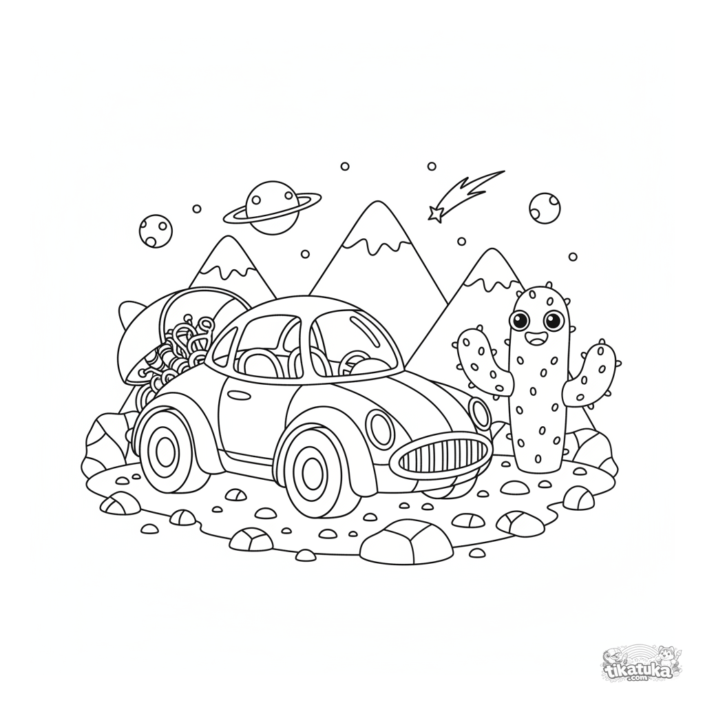 Раскраска для мальчиков 4-6 лет: ретро-футуристический ракетный автомобиль припаркован на марсианском пейзаже. Интересные детали: плавники, купол, марсианское растение.