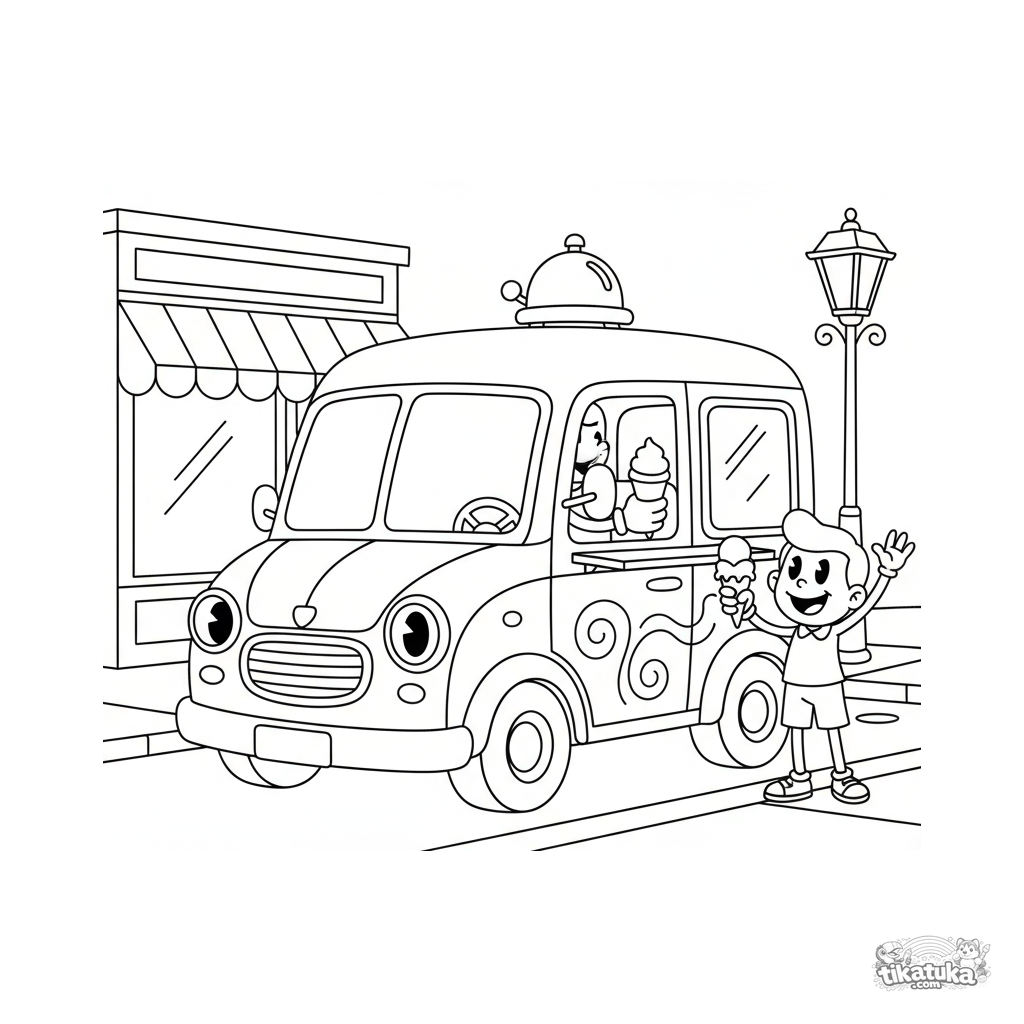 Раскраска для детей 4-6 лет: ретро фургончик мороженого на городской улице. Весёлая машина раздаёт угощения. Простые формы и чёткие контуры идеально подходят для раскрашивания.