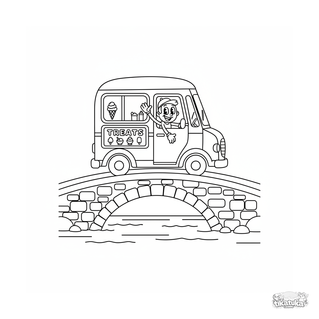 Раскраска для малышей: весёлый винтажный фургон с мороженым едет по мосту над большой рекой. Простые формы, широкие поля.