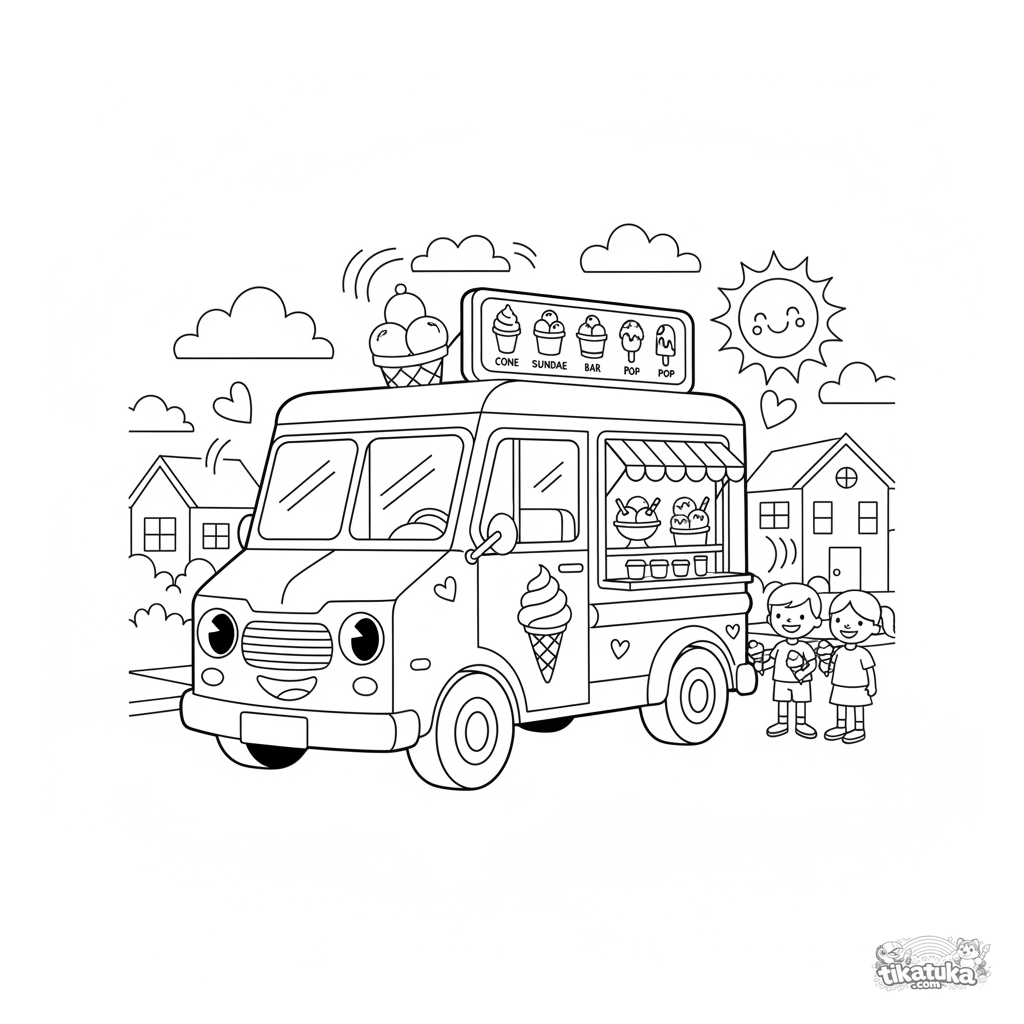 Раскраска для мальчиков 4-6 лет: весёлый ретро-фургон с мороженым и улыбающейся решёткой едет по улице. Яркая и простая транспортная сцена.