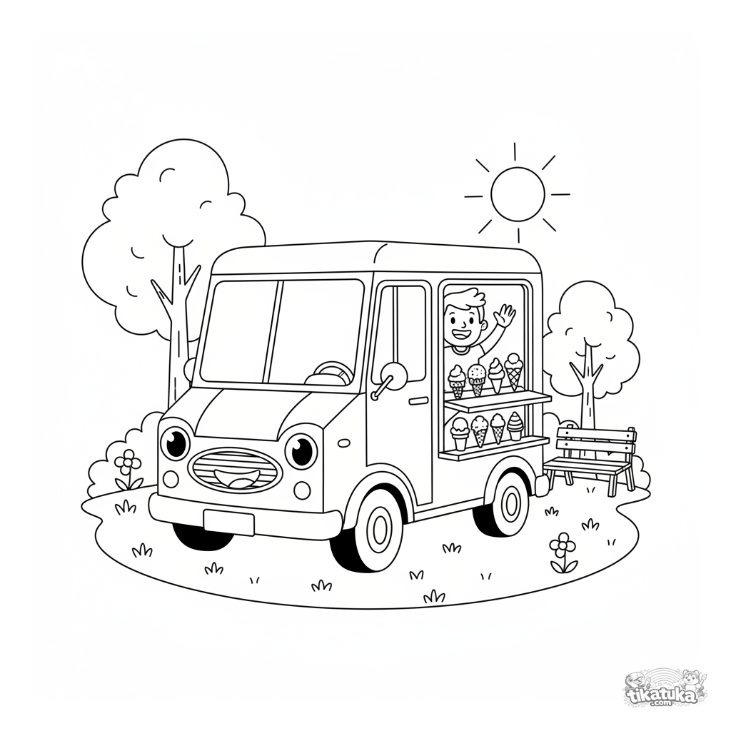 Раскраска для мальчиков 4-6 лет: весёлый ретро-фургон с мороженым улыбается и стоит в солнечном парке. Яркая и простая сцена с транспортным средством.