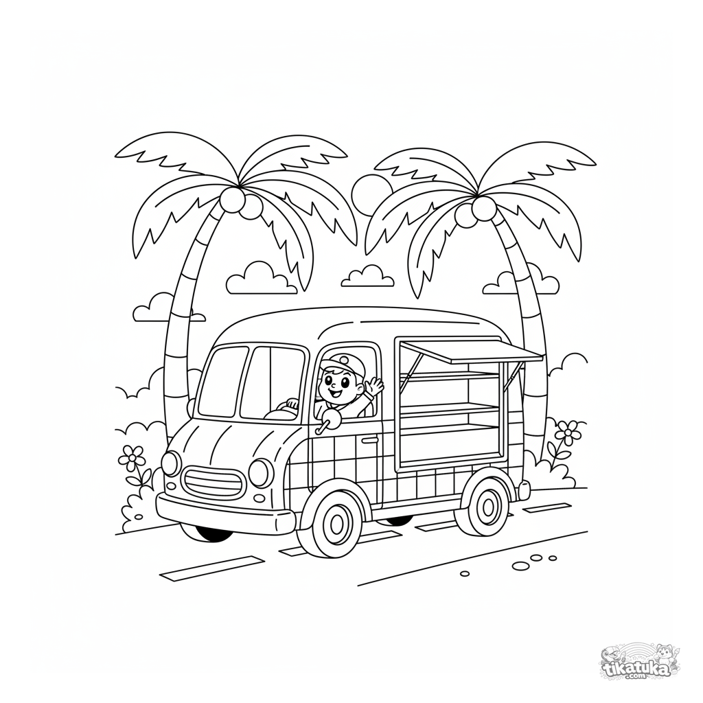 Раскраска с весёлым ретро-фургоном с мороженым, припаркованным под пальмами. Для мальчиков 4-6 лет, интересная тема транспорта и еды.