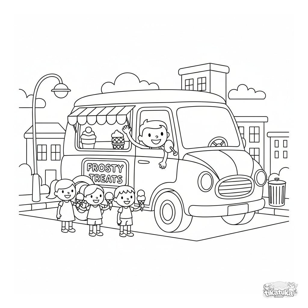 Раскраска для детей 4-6 лет: ретро фургончик мороженого на городской улице. Весёлый водитель раздаёт угощение детям. Простые формы и чёткие контуры.