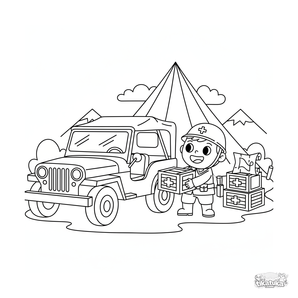 Раскраска для детей 4-6 лет: винтажный армейский джип разгружает ящики с припасами у полевого штаба с палатками. Простые четкие контуры.