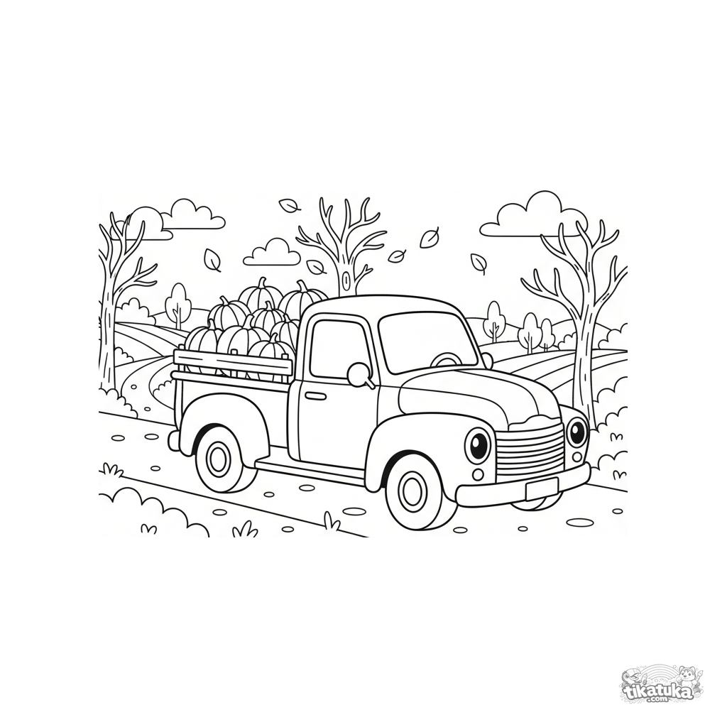 Раскраска для мальчиков 4-6 лет: старинный грузовик везёт урожай тыкв по осенней дороге. Яркая, но не перегруженная деталями сцена для раскрашивания.