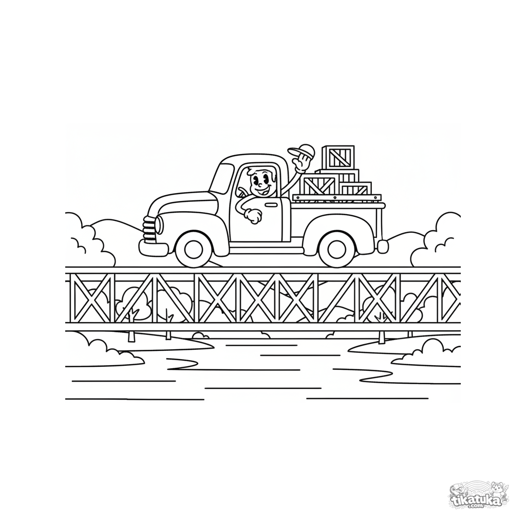 Раскраска для детей 4-6 лет: ретро пикап едет по железному мосту над большой рекой. Весёлый водитель машет кепкой. Чёткие контуры, простые формы.