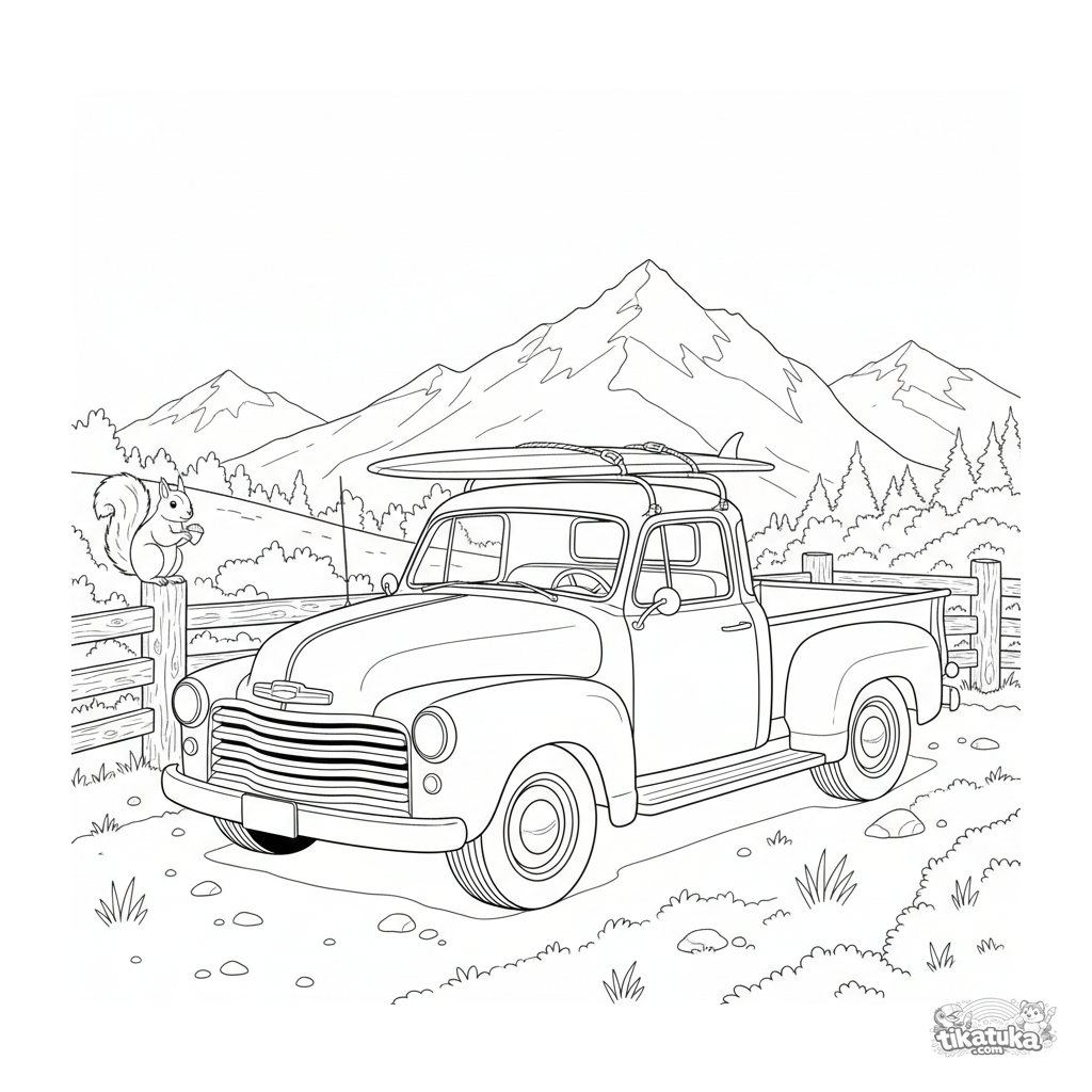 Детализированная раскраска для мальчиков 7-12 лет: ретро пикап с сёрфбордом на крыше стоит на горной смотровой площадке. Реалистичный стиль, много элементов.