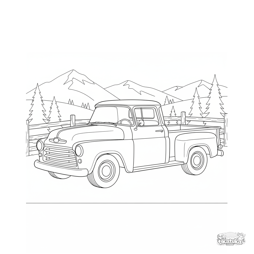 Раскраска для мальчиков 4-6 лет: ретро пикап стоит на горной смотровой площадке. Детализированный, но понятный рисунок для увлечённых машинками.