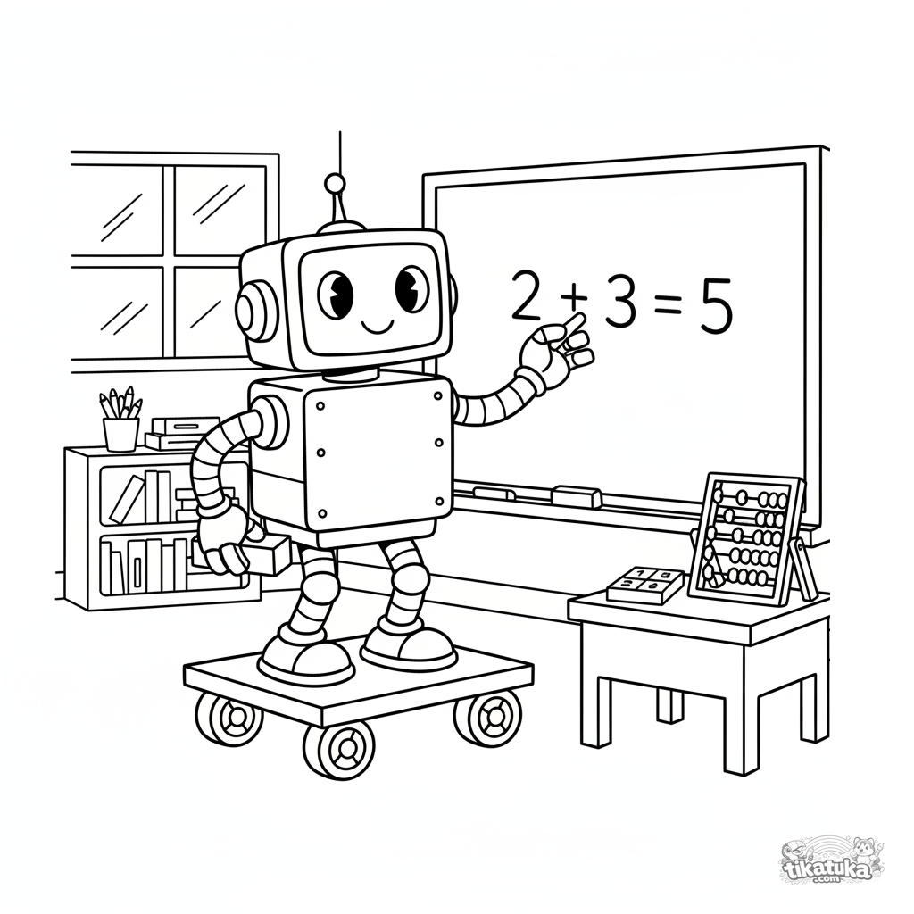 Раскраска для детей 7-9 лет: ретро-робот-помощник учителя пишет уравнение мелом на школьной доске. Стиль старых мультфильмов, счеты и таблица чисел.