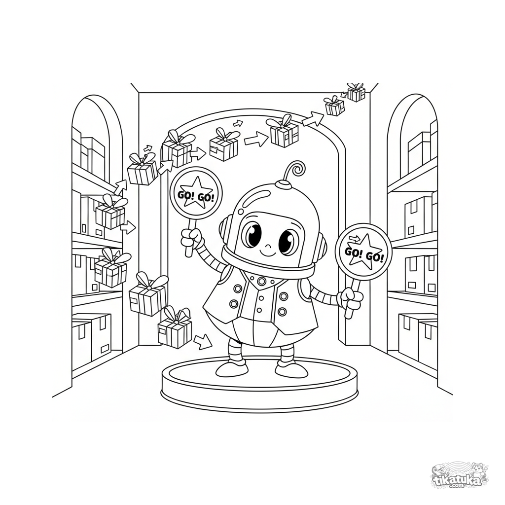 Раскраска для детей 7-9 лет: неуклюжий ретро-робот в жилете управляет потоком грузовых дронов, летящих по коридору склада, с помощью светящихся указателей.