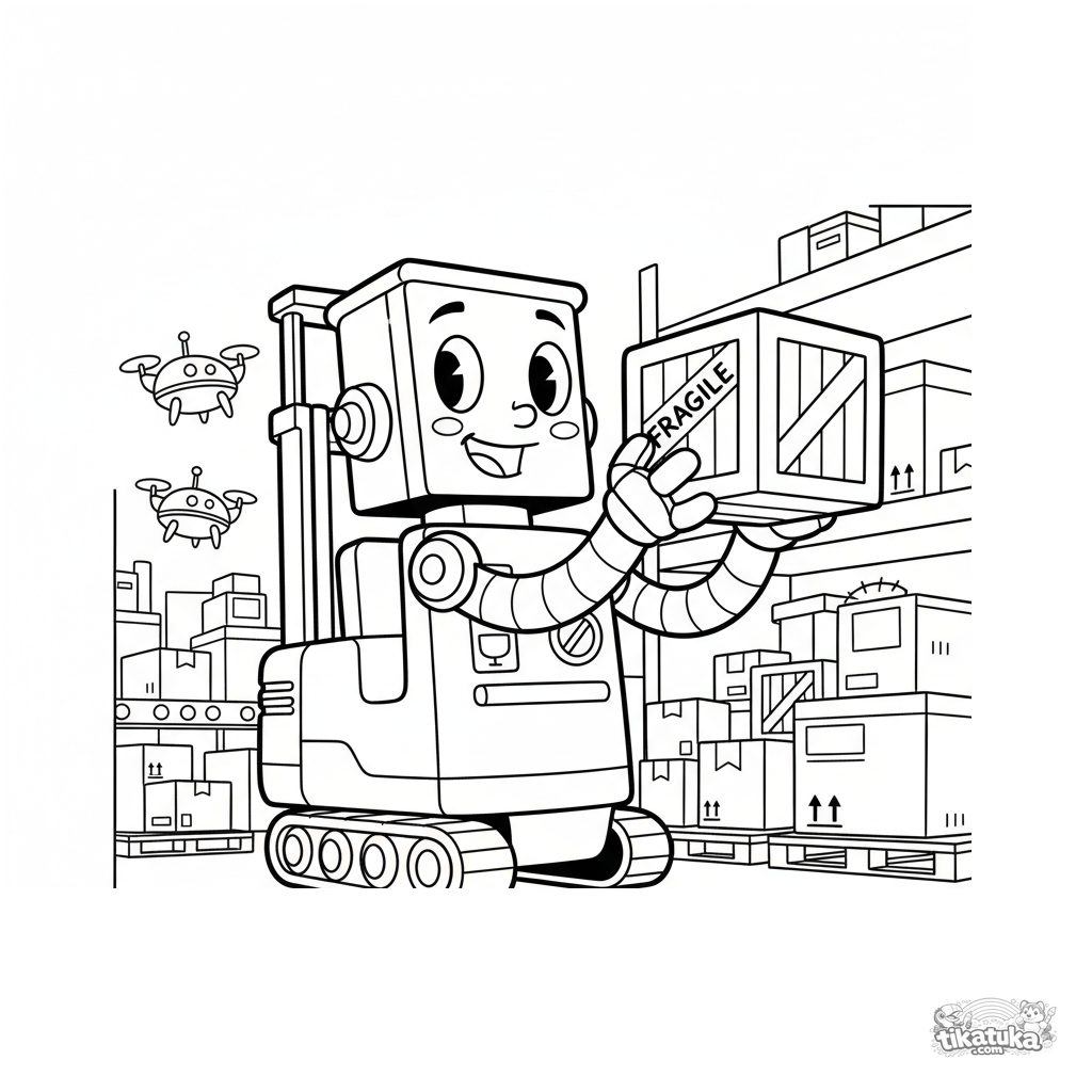Раскраска для детей 7-9 лет: винтажный робот-погрузчик в стиле старых мультфильмов работает на складе, перемещая коробки. Динамичная сцена, выразительные контуры.