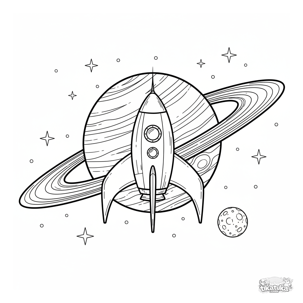 Раскраска: ретро-ракета с большими плавниками летит по орбите вокруг планеты с кольцами. Для детей 5-8 лет. Космическая сцена для раскрашивания.