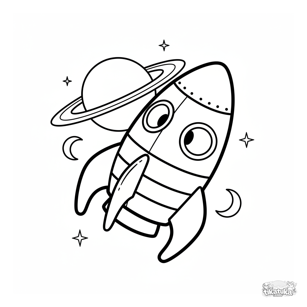 Простая раскраска с ретро ракетой в стиле 1950-х, парящей в космосе рядом с планетой с кольцами. Для малышей 2-5 лет. Крупные простые формы.