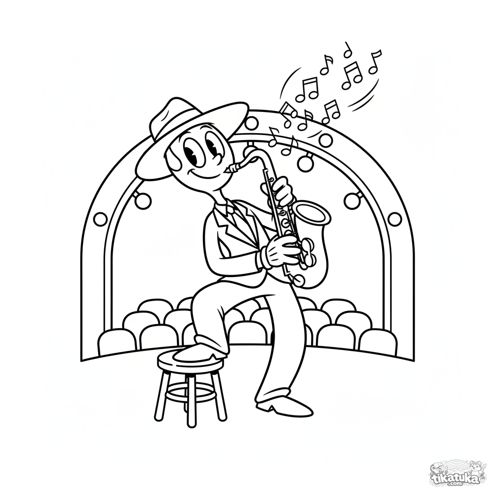 Раскраска для детей 4-6 лет: забавный саксофонист в ретро-стиле играет на сцене концертного зала. Весёлые волнистые линии и ноты.