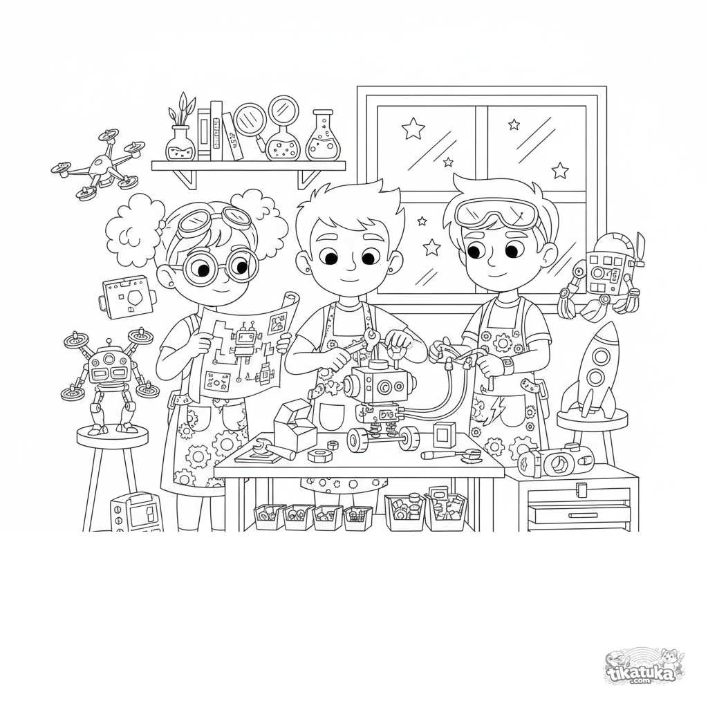 Динамичная раскраска в стиле комикса-приключения: команда друзей собирает робота в хакерском подвале. Множество инструментов, деталей и выразительных поз для детей 10-12 лет.