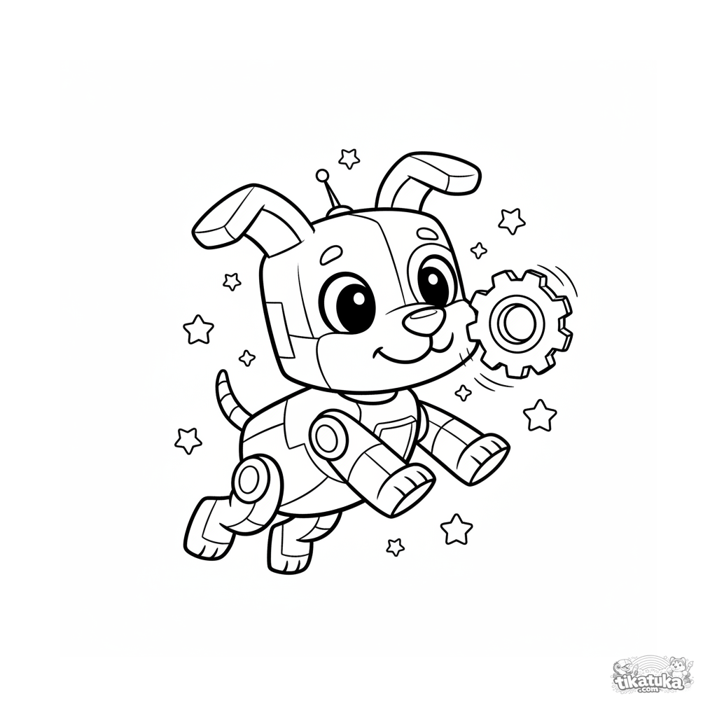 Раскраска для детей 7-9 лет: робот-собака в открытом космосе весело прыгает за летающей шестеренкой среди звезд. Динамичная поза, дружелюбный робот.