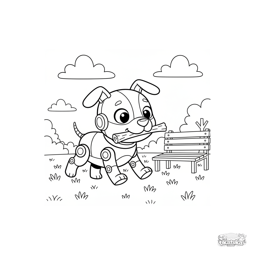 Раскраска для мальчиков 4-6 лет: робот-собака играет в парке, принося палку. Средняя детализация, мультяшный стиль, весёлая сцена.