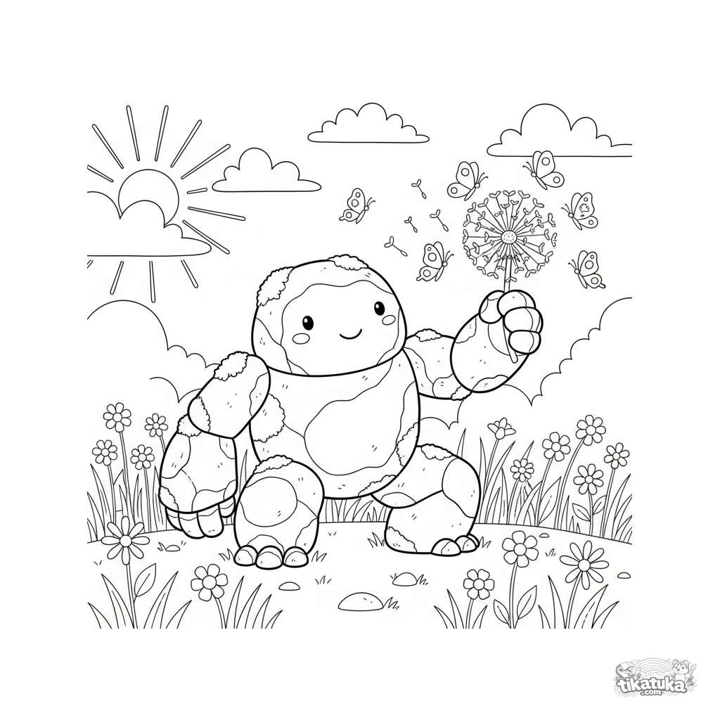 Раскраска для детей 4-6 лет: добрый каменный голем в солнечном лугу предлагает цветок одуванчика стайке разноцветных бабочек.