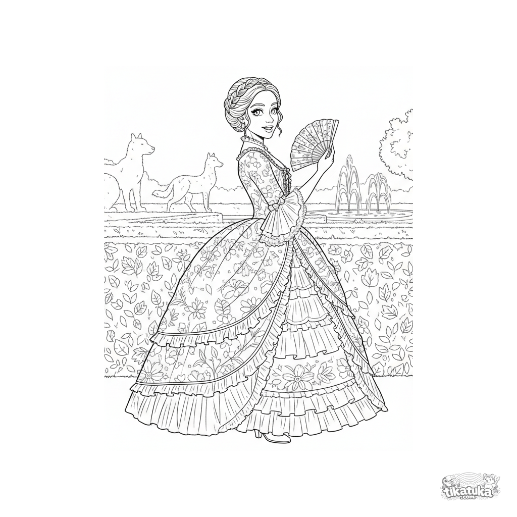Сложная раскраска для девочек 10-12 лет: историческое платье в стиле рококо в садовом лабиринте. Многослойные рюши, детализированный фон.