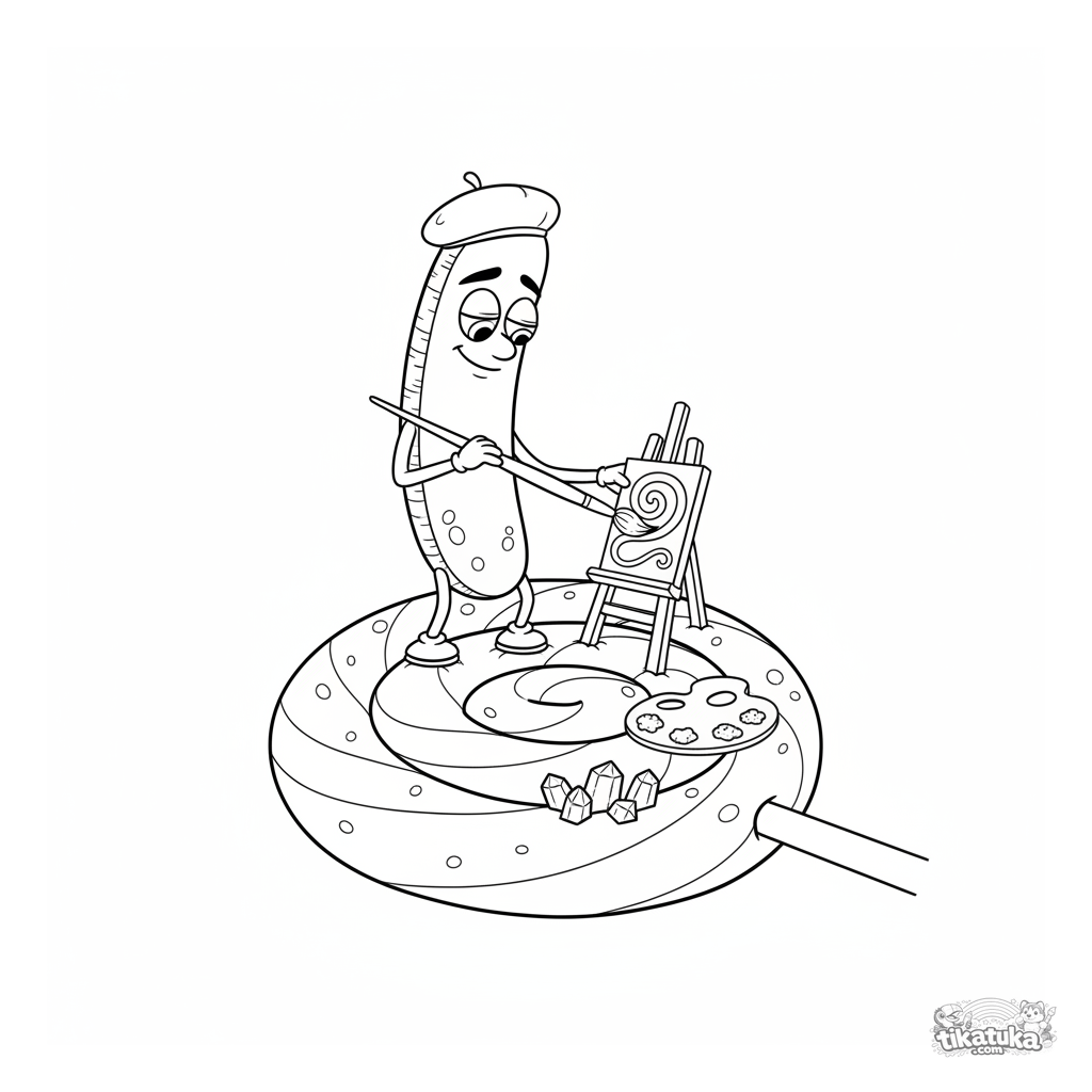 Сложная раскраска для детей 10-12 лет: палочковидная бактерия в берете рисует на мольберте, стоя на поверхности леденца. Детализированная сцена для терпеливых художников.