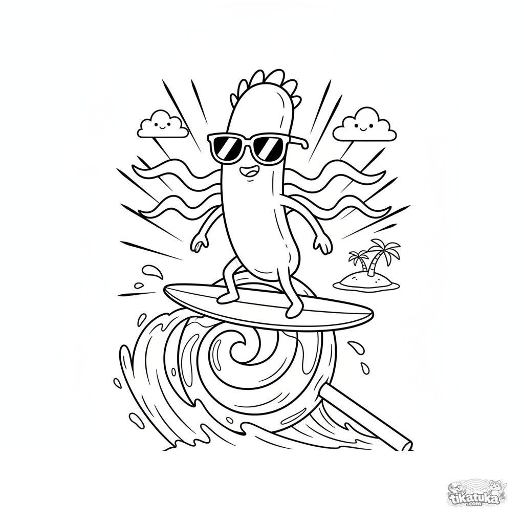 Раскраска для детей 7-9 лет: палочковидная бактерия в очках ловко катается на сёрфе по волне из леденца. Динамичная сцена.