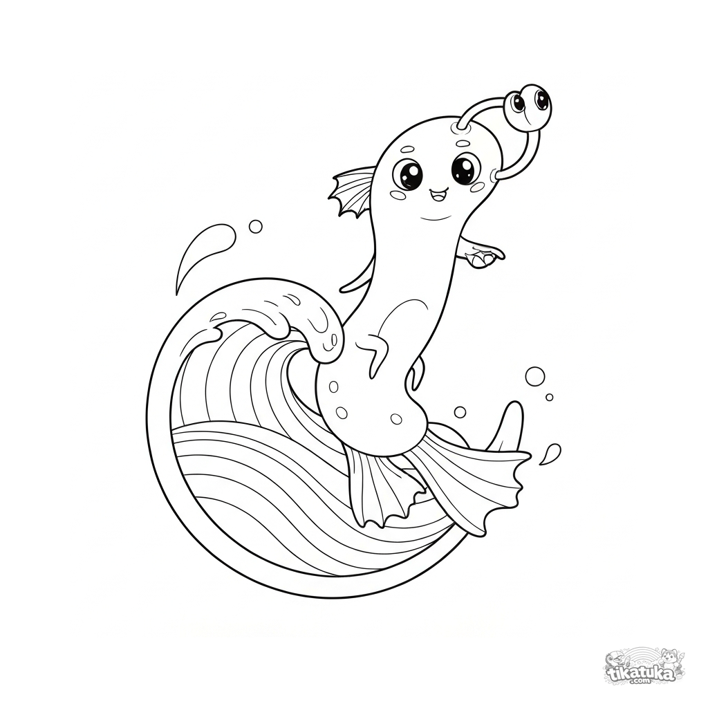 Раскраска для детей 6-9 лет. Забавный микроб-бацилла с ластами и глазами покоряет яркую волну внутри капли воды. Скачать бесплатно.
