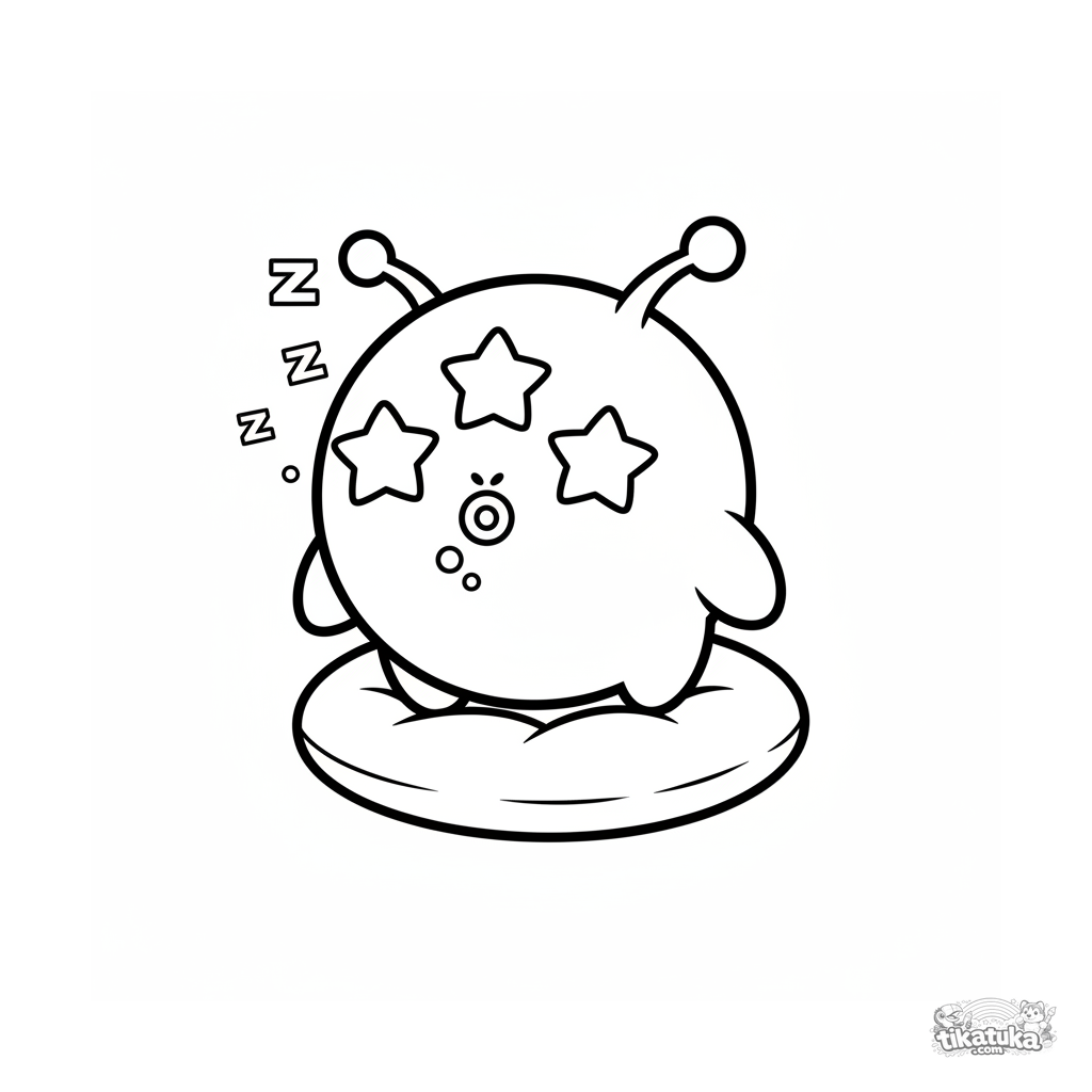 Раскраска в кавай-стиле для малышей 2-3 лет: круглый дружелюбный инопланетянин спит над подушкой. Очень простые формы, звездные глазки.