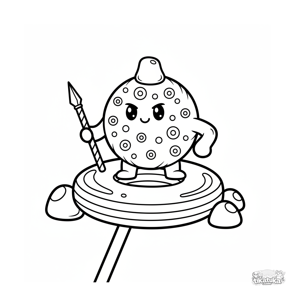 Простая раскраска для малышей 2-3 года: круглый плюшевый микроб-страж стоит на леденце. Крупные формы, мало деталей, идеально для первых карандашей.