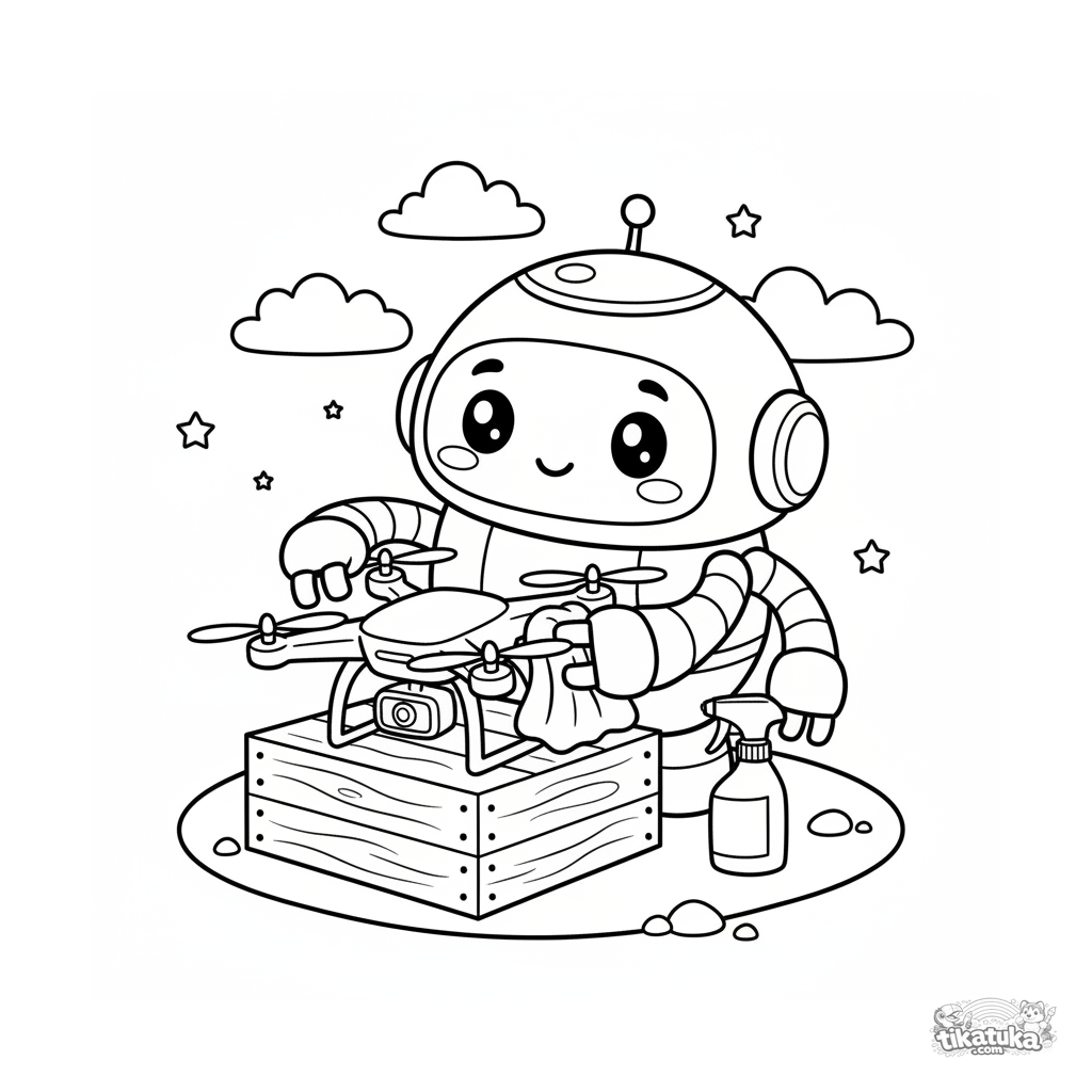 Раскраска для детей 7-9 лет: круглый робот-уборщик тщательно полирует лопасти пропеллера маленького дрона, стоящего на ящике в складе, с тряпкой и пульверизатором рядом.