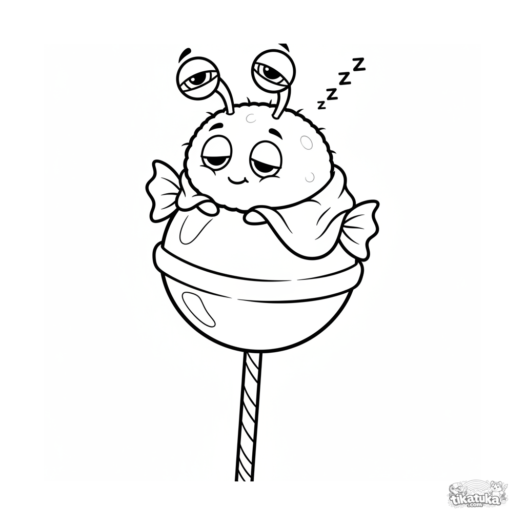 Простая раскраска для малышей 2-3 лет: круглый плюшевый микроб со смешными глазками на стебельках сладко спит на большом леденце. Крупные формы, толстые контуры.