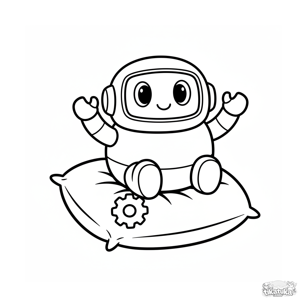 Простая раскраска для малышей 2-3 лет: круглый дружелюбный робот машет рукой, сидя на мягкой подушке, рядом лежит шестеренка. Крупные четкие формы.