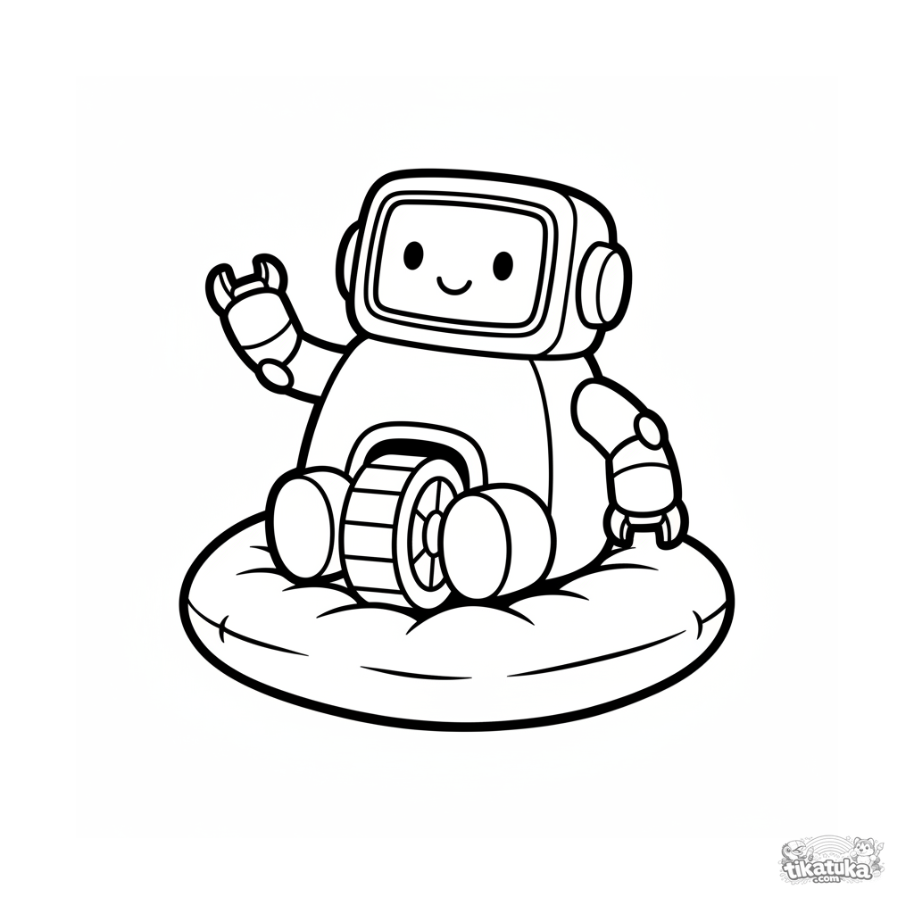 Простая раскраска для детей 2-3 лет: круглый дружелюбный робот-игрушка сидит на подушке и машет. Крупные четкие контуры, легко раскрашивать.