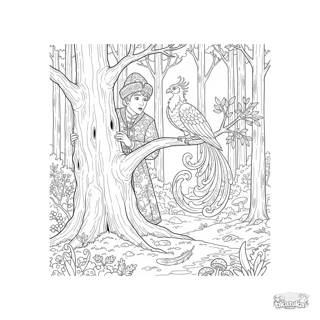Раскраска по мотивам сказки 'Жар-птица'. Иван-царевич наблюдает за волшебной птицей в лесу. Для детей 7-12 лет. Детализированная сцена с дубом и светящимся пером.