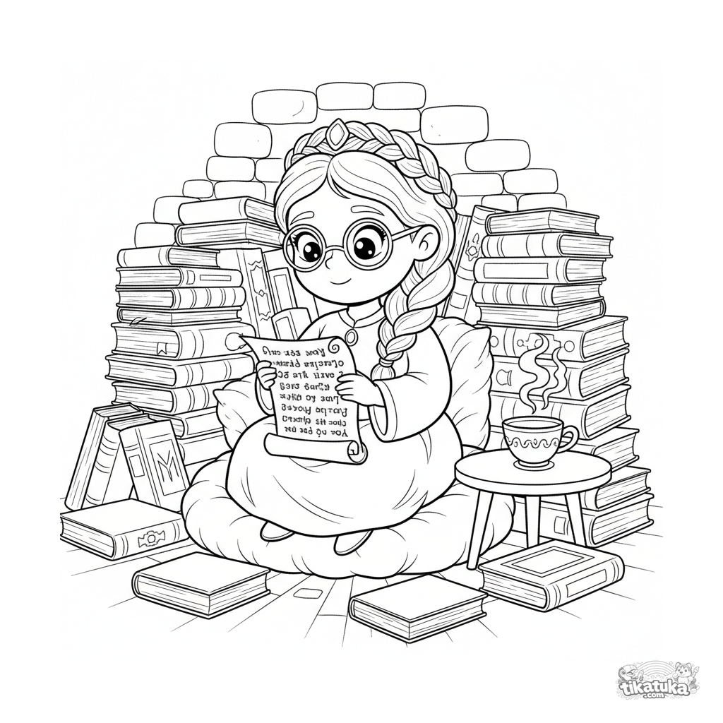 Раскраска для детей 7-9 лет: принцесса-учёная в уютной башенной библиотеке среди книг и свитков. Идеально для развития внимательности.