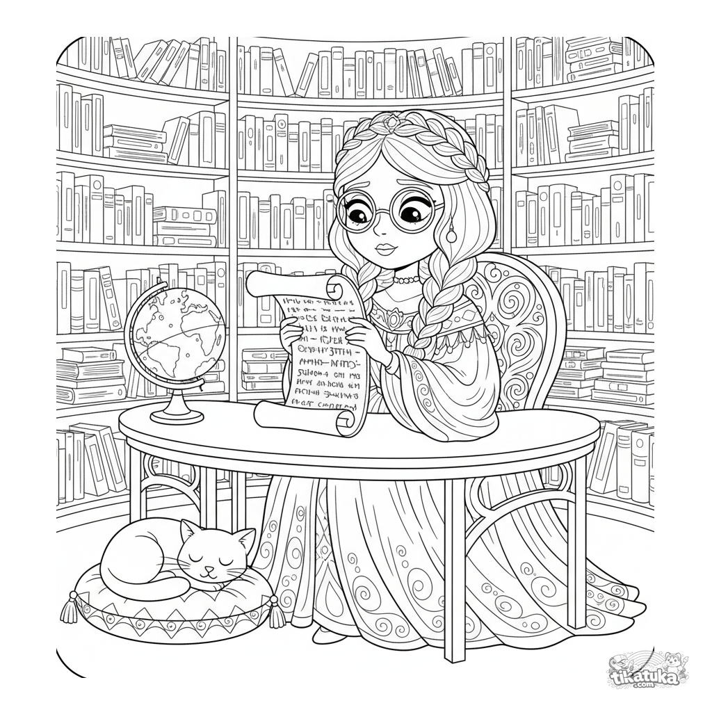 Раскраска для детей 10-12 лет: принцесса-учёная изучает древний свиток в башенной библиотеке. Детализированные полки с книгами, глобус и спящий кот.